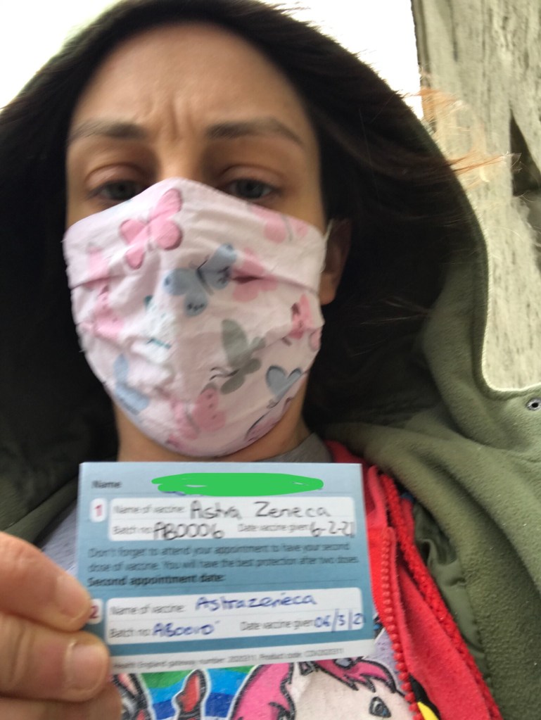 My husband had his first shot (Under 50s, underlying health conditions category) on Wednesday 24th March. His was not at our local hub, and he had to go all the way to the town’s hub (a 55 minute bus ride, compared to my 25 minute bus ride). He also went during lockdown restrictions. He got to go in early too, and also had the AstraZeneca vaccine. He said it was a bit sore at entry point, but didn’t understand what all the fuss was about. In the early hours of the morning, I was rudely awoken by shaking. I am dead to the world – unless a child calls “mam!”, which has not happened for a long time due to their age – so to be woken by anything other than needing to pee shocked me. I then hear this weak voice… “I’m so cold”. I roll over, reach out my hand and feel that he is boiling hot. But he will not stop shivering, and asks me to pass him his dressing gown. He didn’t sleep well, and I was woken up two more times from his shivering. The next morning he was ‘dying’. He was still so cold – two pairs of clothes, dressing gown and heating were needed – and was tempted to call in sick from work – he has been homeworking since March 2020. He said he felt like he does before he has an epileptic fit, and he was worried. Friday, he is back to normal. No shivering in the night. No hot to the touch. No dehydration. Just normal. Though he does have a cold still.